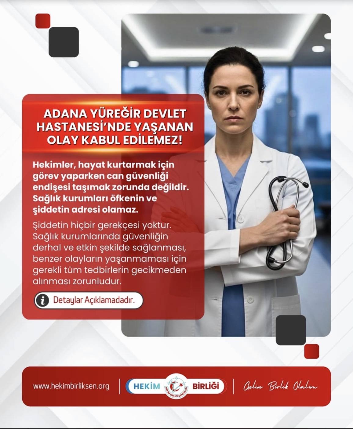Konu hakkında açıklama yapan Hekim Birliği Sendikası yönetimi, “Adana Yüreğir Devlet Hastanesi’nde yaşanan olay kabul edilemez! Bir hastanın vefatının ardından bazı hasta yakınlarının acil servisi basarak hekimlere yönelik saldırgan bir tutum sergilemesi, sağlık kurumlarında giderek artan şiddetin ne kadar tehlikeli bir noktaya ulaştığını bir kez daha göstermiştir. Olay sırasında görev yapan hekimlerin güvenlik nedeniyle gizlice acil servisten çıkarılmak zorunda kalması, içinde bulunduğumuz tabloyu açıkça ortaya koymaktadır. Hekimler, hayat kurtarmak için görev yaparken can güvenliği endişesi taşımak zorunda değildir. Sağlık kurumları öfkenin ve şiddetin adresi olamaz. Şiddetin hiçbir gerekçesi yoktur. Sağlık kurumlarında güvenliğin derhal ve etkin şekilde sağlanması, benzer olayların yaşanmaması için gerekli tüm tedbirlerin gecikmeden alınması zorunludur. Hekim Birliği olarak sağlıkta şiddetin her türlüsünü kınıyor, meslektaşlarımızın yanında olduğumuzu bir kez daha vurguluyoruz” ifadelerine yer verdi. (BSHA – Bilim ve Sağlık Haber Ajansı)